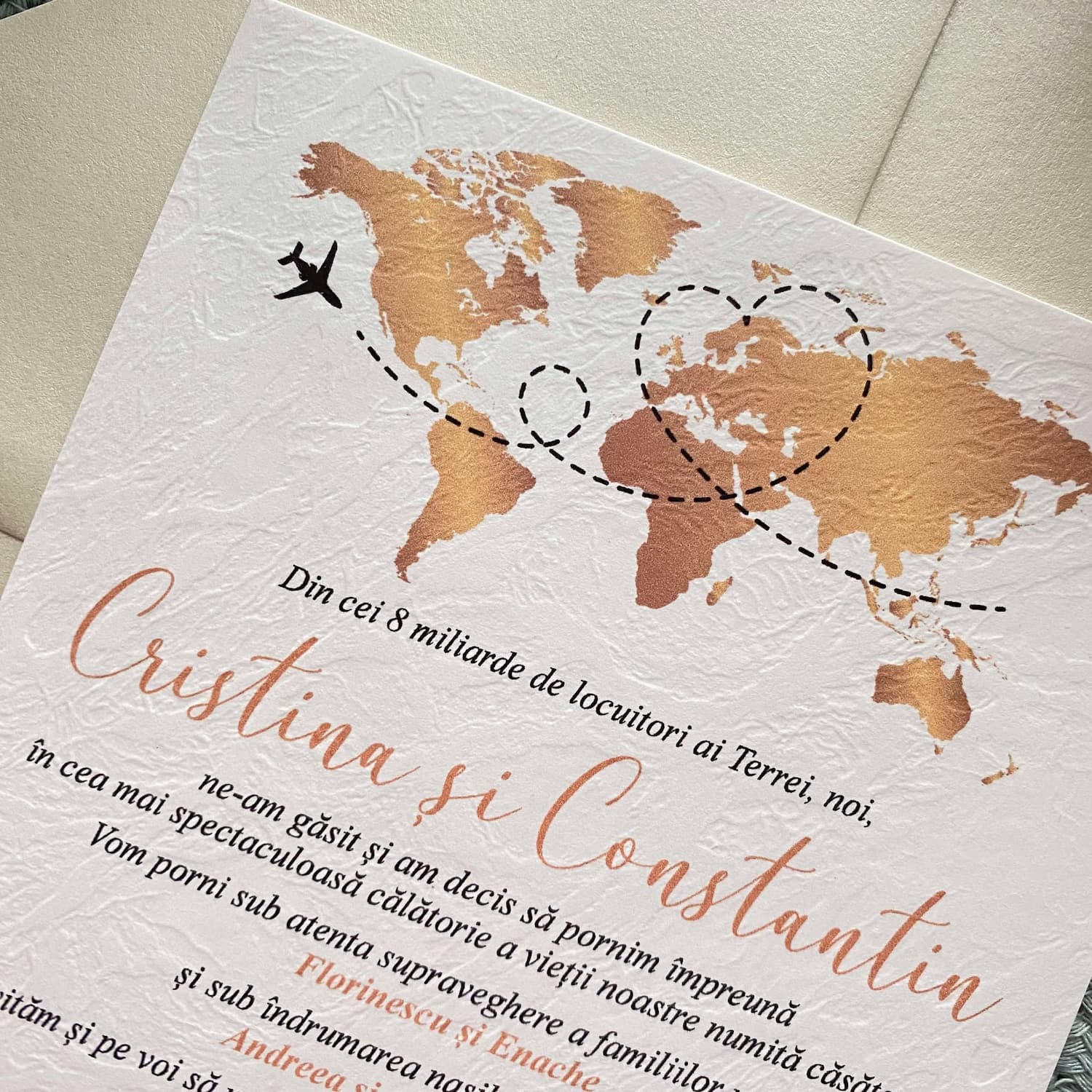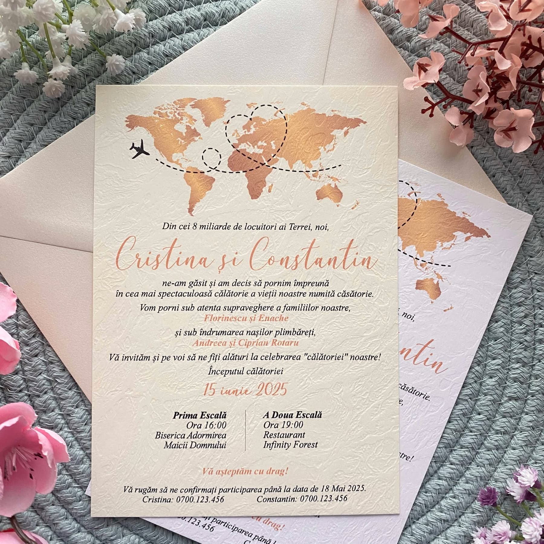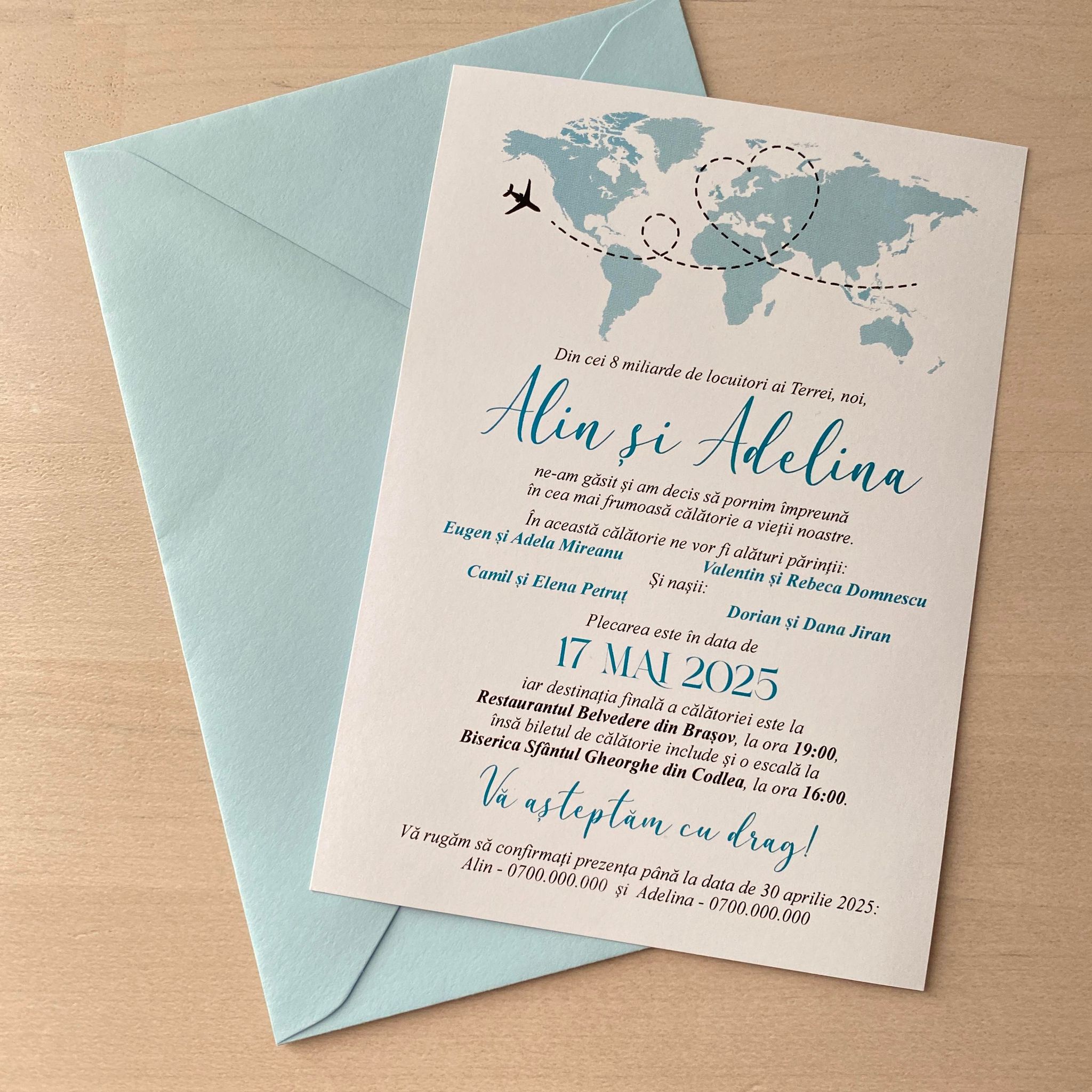 Invitatii nunta travel – model cu harta lumii cu plic alb inclus.