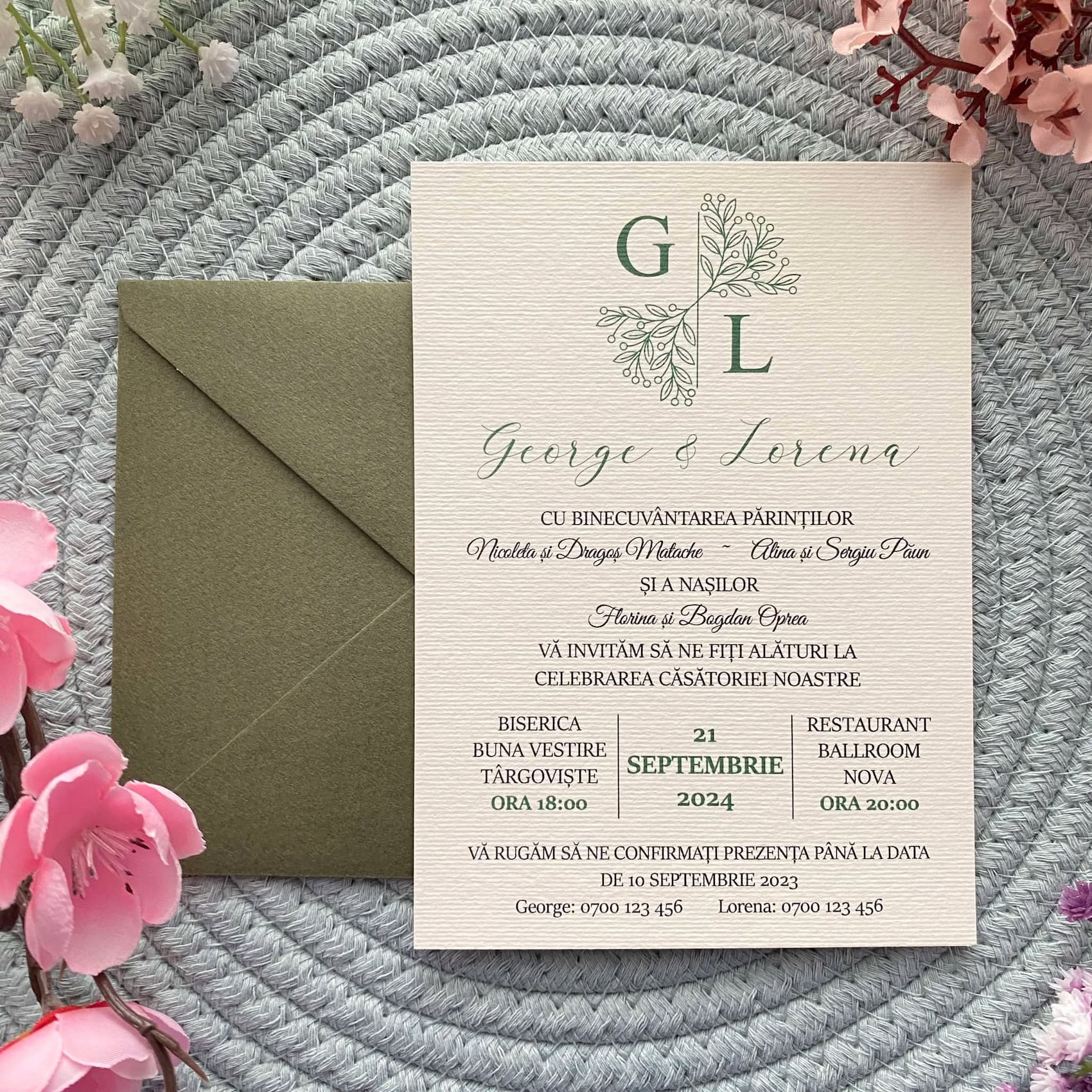 Invitație de nuntă pe carton texturat, model modern minimalist cu monogramă.