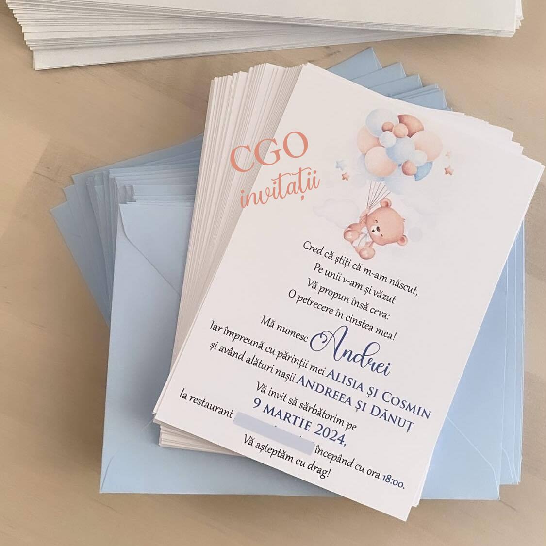 Invitații botez ursulet pentru băieți, model albastru cu baloane.