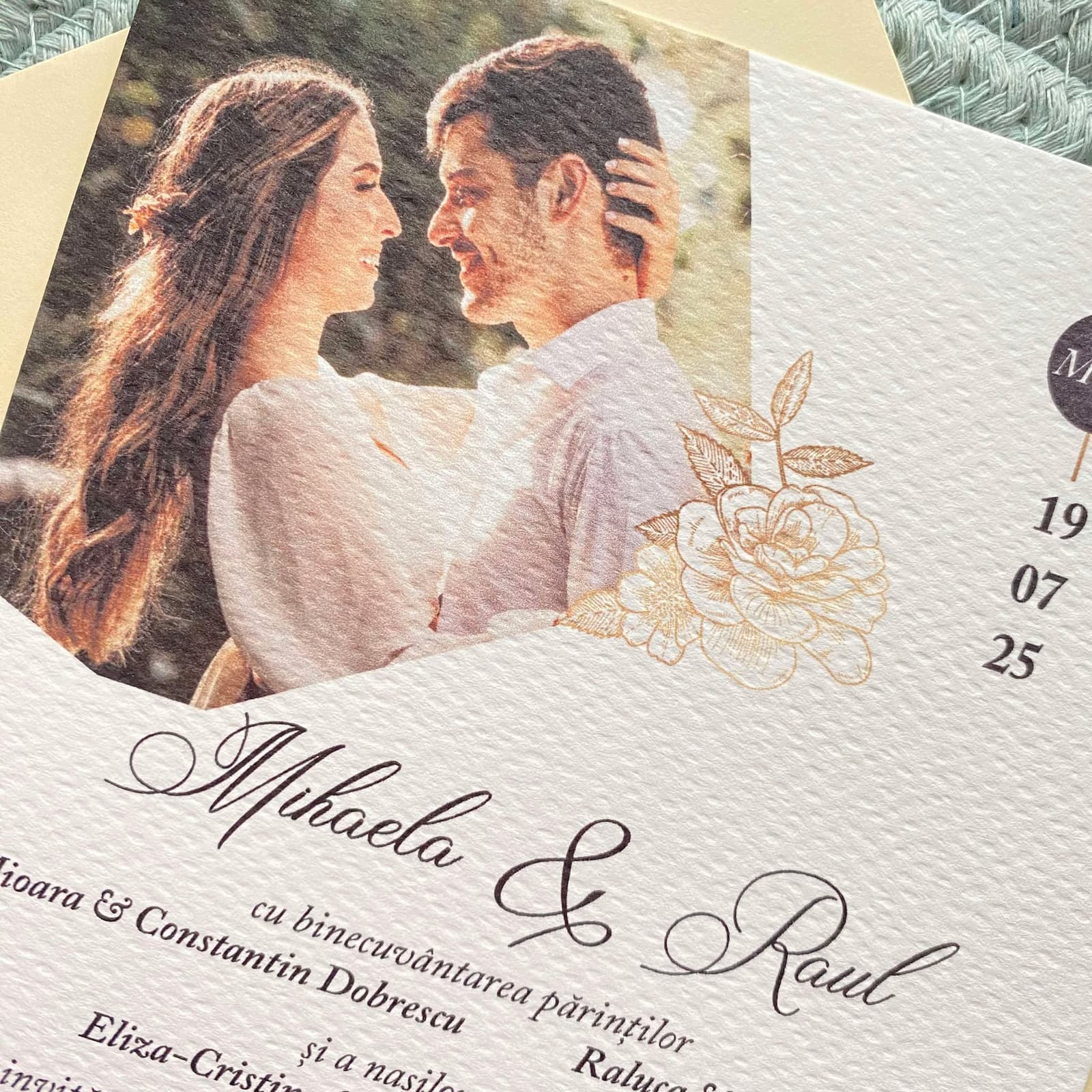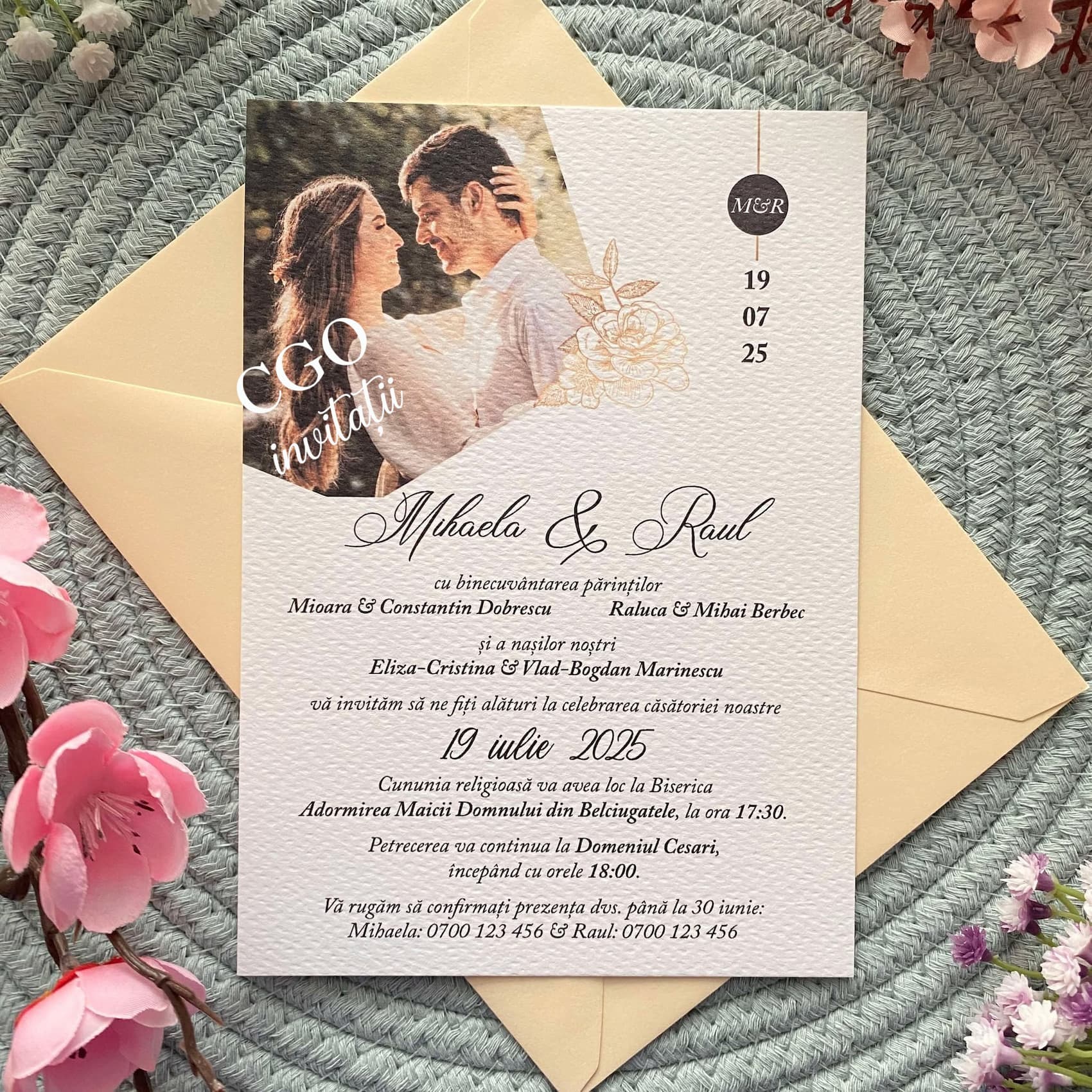 Invitatii de nunta cu poza mirilor, pe carton texturat alb cu plic la alegere (colorat/sidefat).