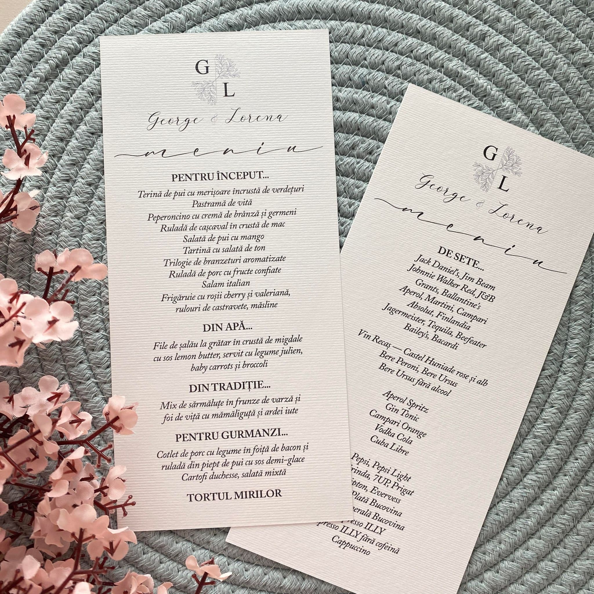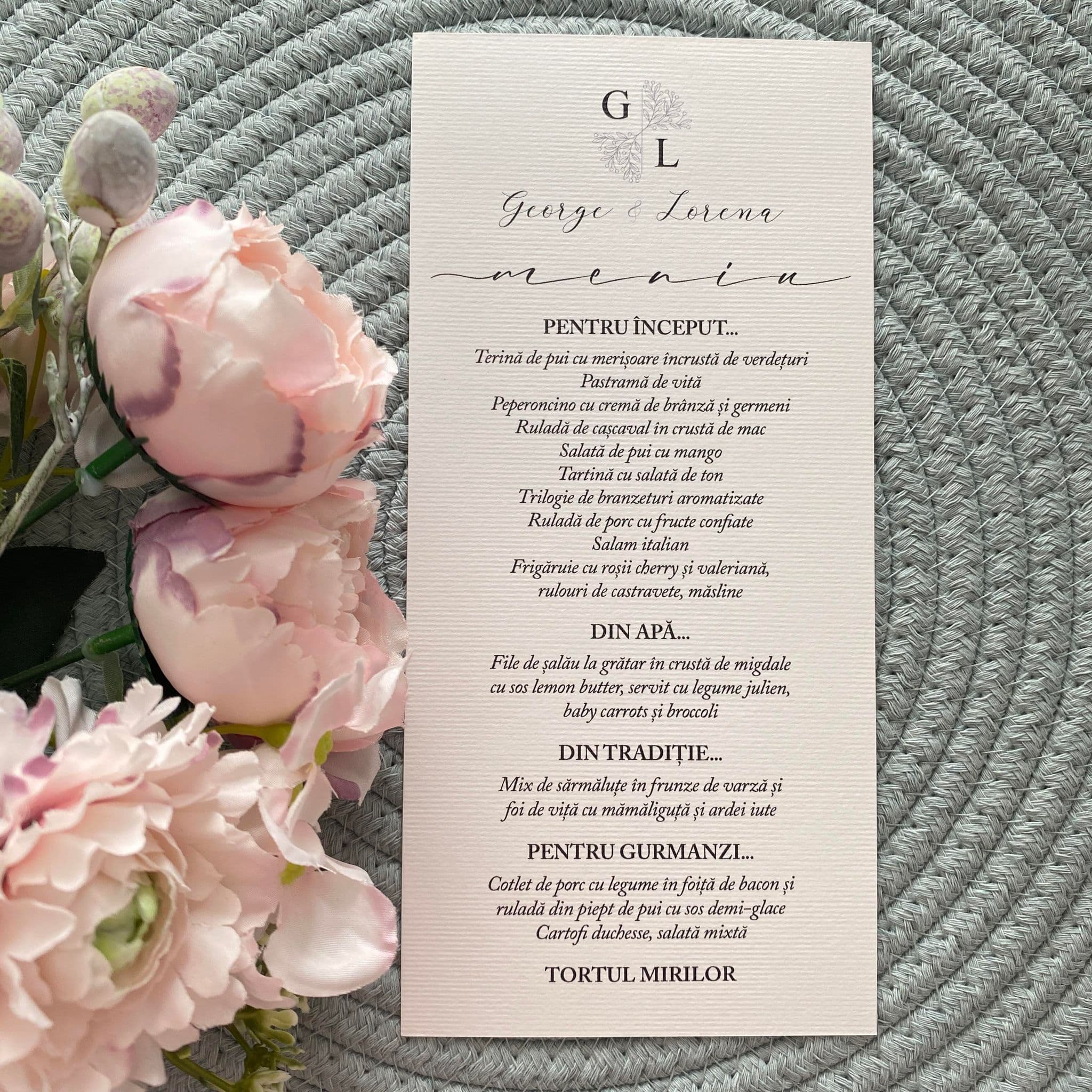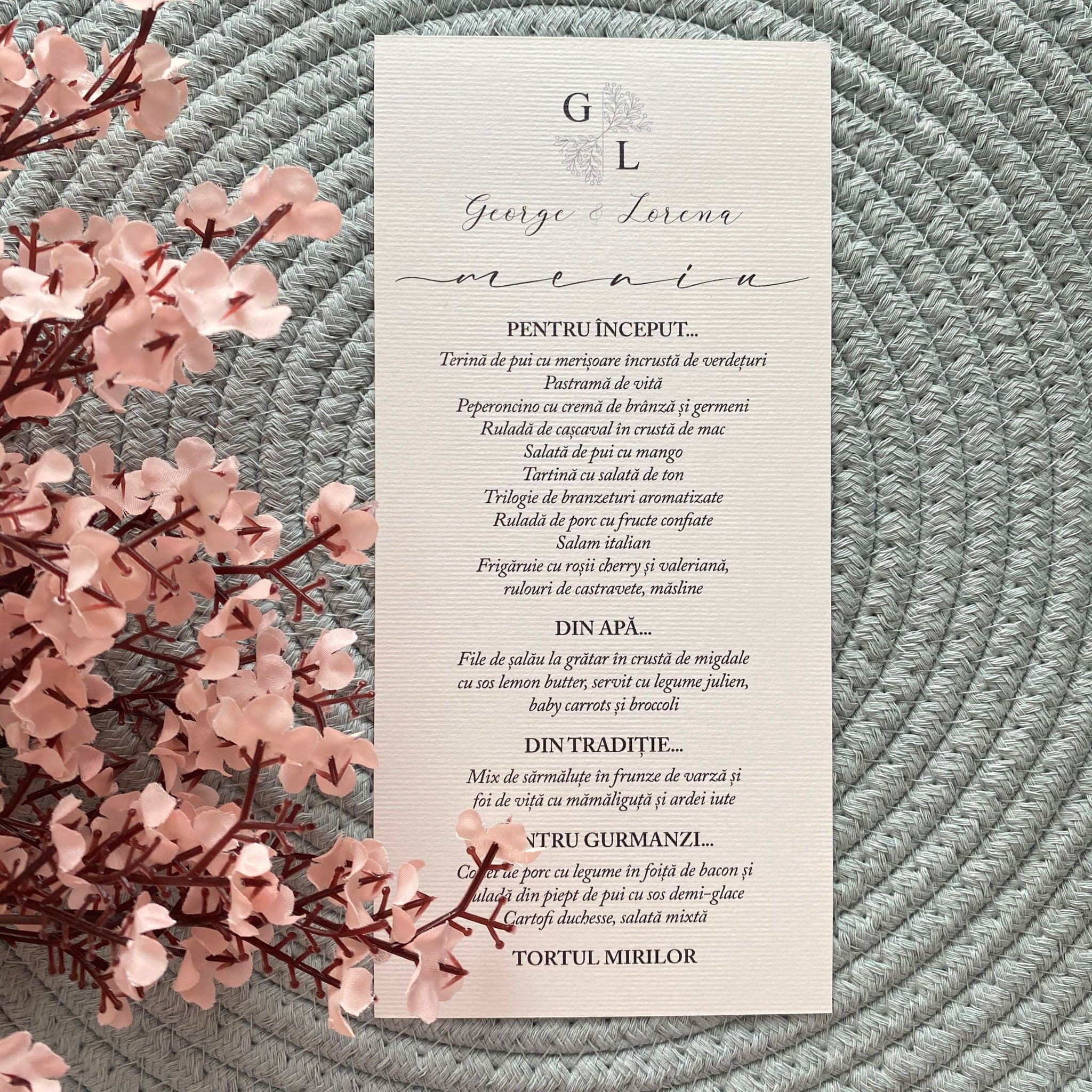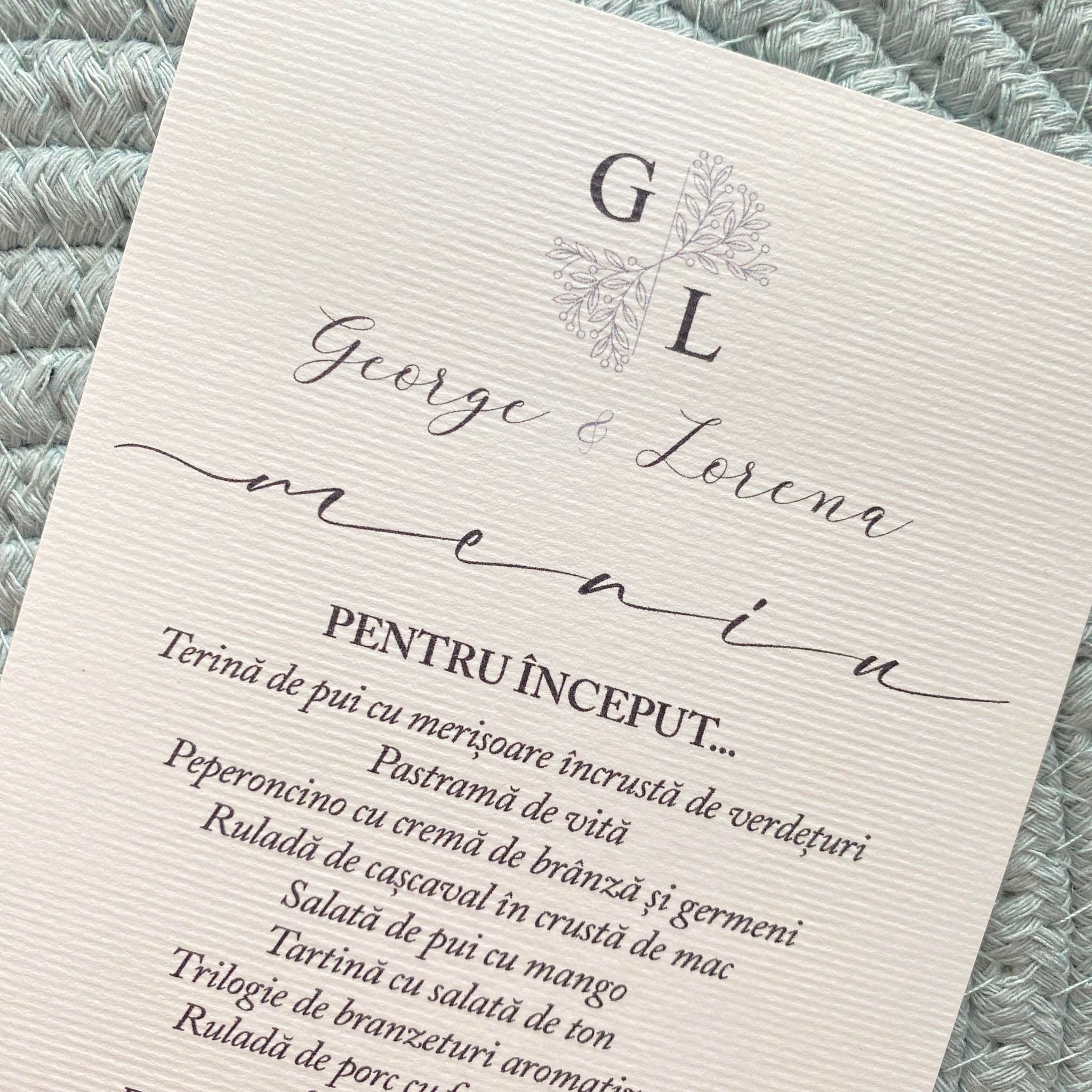Meniu nunta individual fata-verso 24 Minimalist Monogram realizat pe carton texturat la alegere (alb, ivory, diverse texturi), cu monograma. Se poate realiza în aceeași tematică cu invitațiile. Se poate realiza si pe carton la alegere: pretul scade cu 1 RON/buc.
